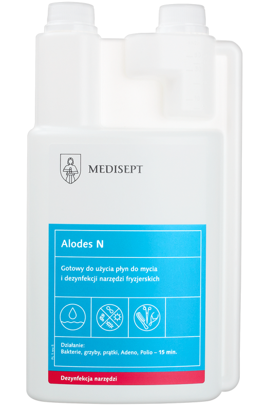 Cechy Produktu: Alodes N to gotowy do użycia płyn, idealny do jednoczesnego mycia i dezynfekcji narzędzi fryzjerskich i kosmetycznych, takich jak grzebienie, szczotki, wałki, nożyczki do włosów, oraz narzędzia do manicure, które nie naruszają ciągłości tkanek. Płyn jest skuteczny w dezynfekcji w zaledwie 15 minut.