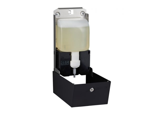 Trwałe i estetyczne wykonanie: Dozownik wykonany jest ze stali nierdzewnej . Posiada spawane i szlifowane łączenia boków, niewidoczne zawiasy, a także trwały stalowy zamek bębenkowy zlicowany z powierzchnią urządzenia. Dozownik zabezpieczony jest na kluczyk, co zapewnia bezpieczeństwo urządzenia.