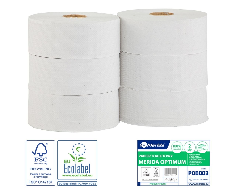 Papier toaletowy MERIDA OPTIMUM to profesjonalne rozwiązanie do toalet o średnim i wysokim natężeniu ruchu. Wykonany z wysokiej jakości makulatury, produkt łączy troskę o środowisko z komfortem użytkowania. Dzięki dużej średnicy rolki (28 cm) i długości aż 340 metrów, idealnie sprawdza się w miejscach publicznych, biurach, zakładach pracy oraz placówkach edukacyjnych.