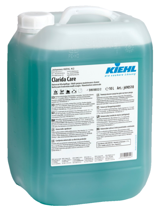 Clarida Care to profesjonalny, uniwersalny płyn przeznaczony do codziennego mycia i pielęgnacji wszelkiego rodzaju wodoodpornych podłóg twardych i elastycznych. Doskonale sprawdza się m.in. na wykładzinach z PCW, linoleum, gumy, kamienia naturalnego i sztucznego, a także na podłogach zabezpieczonych powłokami ochronnymi.
