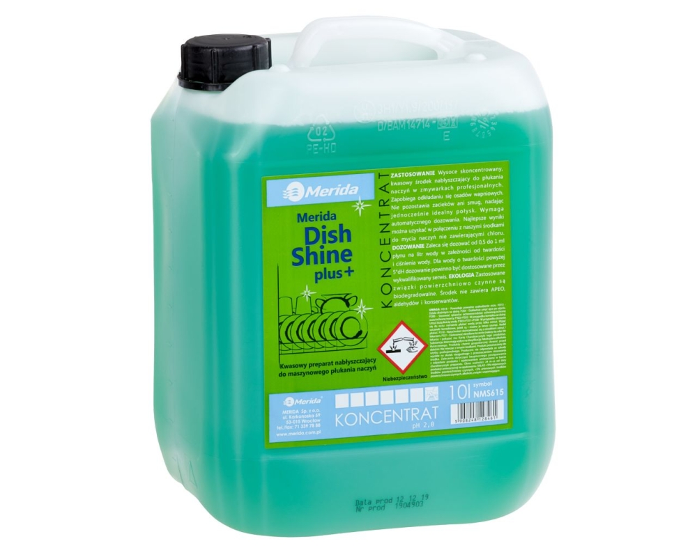 MERIDA DISH SHINE PLUS to wysoce skoncentrowany, kwasowy środek nabłyszczający, opracowany specjalnie z myślą o profesjonalnych kuchniach, restauracjach, hotelach i stołówkach. Preparat zapewnia doskonały efekt nabłyszczenia oraz perfekcyjną czystość naczyń, eliminując wszelkie zacieki i smugi.