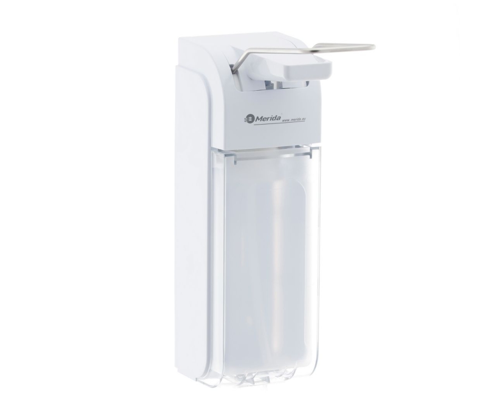Praktyczny i higieniczny dozownik płynu dezynfekcyjnego z przyciskiem łokciowym, idealny do miejsc o wysokich wymaganiach sanitarnych, takich jak szkoły, placówki medyczne, biura czy zakłady przemysłowe.