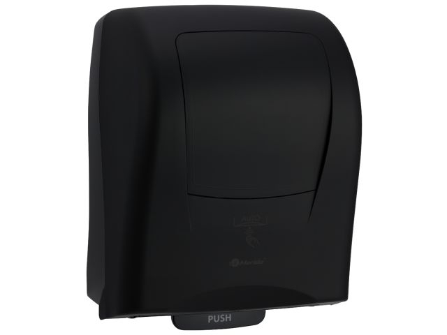 Bezdotykowy automatyczny podajnik ręczników papierowych w roli MERIDA AMADEUS SILKY BLACK to nowoczesne urządzenie, które zapewnia higieniczne i wydajne użytkowanie ręczników papierowych. Oto główne cechy tego produktu: