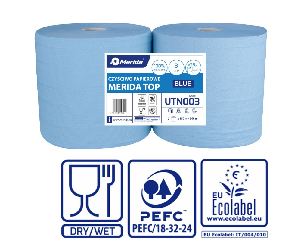 Czyściwo papierowe MERIDA TOP 28 to wysokiej jakości, trzywarstwowe czyściwo w kolorze niebieskim, o długości 150 metrów na zgrzewkę, przeznaczone do szybkiego wchłaniania wody, olejów i smarów. Produkt jest opakowany w zgrzewkę zawierającą 2 role czyściwa.