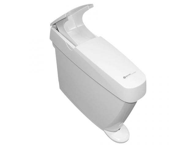 Kształt umożliwia postawienie między toaletą a ścianą: Specjalny kształt pojemnika pozwala na łatwe postawienie go między toaletą a ścianą, nawet w małych kabinach czy pomieszczeniach.
