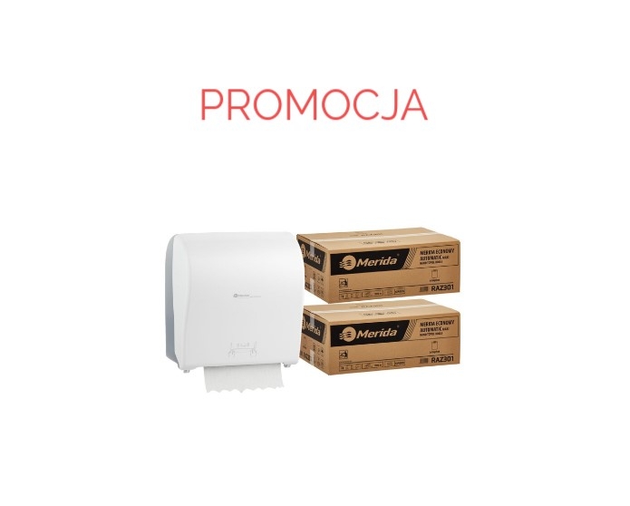 W ramach tej promocji oferujemy mechaniczny podajnik ręczników MERIDA SOLID CUT oraz 2 kartony ręczników MERIDA ECONOMY AUTOMATIC, co stanowi idealne połączenie niezawodności, wydajności oraz oszczędności dla Twojej firmy, biura lub przestrzeni publicznej.