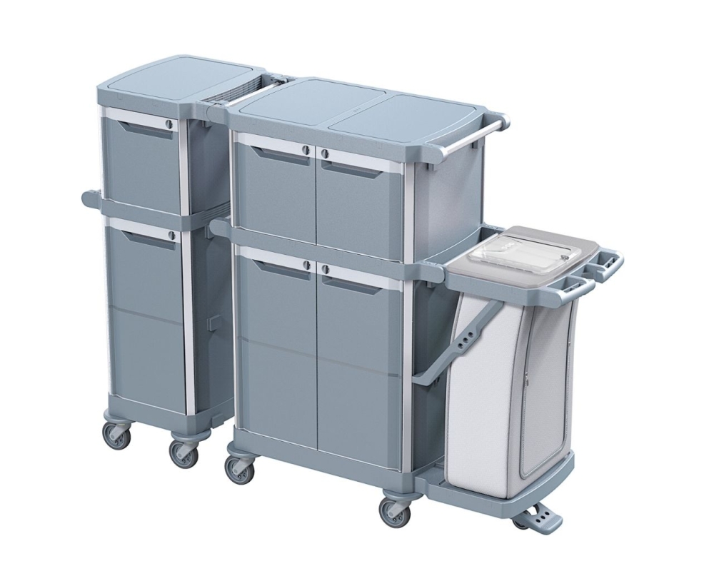 Rozbudowany, wielofunkcyjny wózek serwisowy zaprojektowany z myślą o profesjonalnym utrzymaniu czystości w dużych obiektach, takich jak hotele, biurowce czy placówki publiczne. Dzięki przemyślanej konstrukcji umożliwia doskonałą organizację pracy oraz wygodne przechowywanie środków czystości, akcesoriów i odpadów.