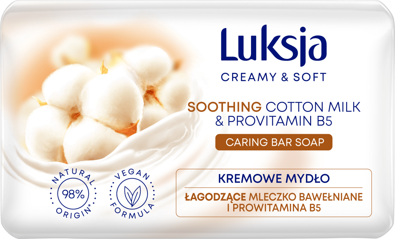 Kremowe mydło w kostce Luksja z mleczkiem bawełnianym i prowitaminą B5 to doskonały wybór do codziennej pielęgnacji skóry. Mydło delikatnie oczyszcza dłonie, jednocześnie pielęgnując i nawilżając skórę dzięki zawartości odżywczych składników.