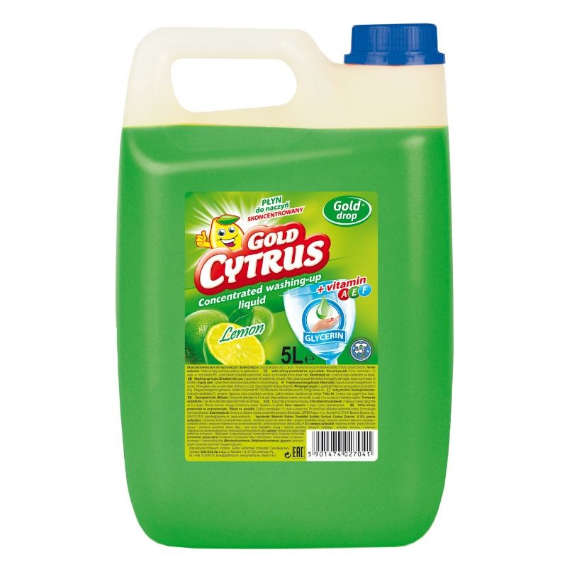 GOLD CYTRUS DO NACZYŃ ZIELONY to wysokiej jakości płyn do mycia naczyń o orzeźwiającym zapachu cytryny. Produkt skutecznie usuwa tłuszcz i inne zabrudzenia, pozostawiając naczynia czyste i lśniące. Duże, 5-litrowe opakowanie sprawia, że jest to ekonomiczne rozwiązanie zarówno dla gospodarstw domowych, jak i miejsc o dużym zużyciu, takich jak restauracje czy stołówki.