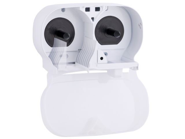 Dwa miejsca na rolki: Pojemnik ten pozwala na umieszczenie dwóch rolek papieru toaletowego bez gilzy. Dzięki temu użytkownicy nie muszą martwić się o brak papieru, a obsługa i serwis jest wyjątkowo wygodny.
