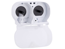 Podajniki na papier toaletowy w listkach to rozwiązanie, które pozwala na precyzyjne dozowanie papieru, co znacząco zmniejsza jego zużycie. Pojemniki tego typu są często stosowane w łazienkach o podwyższonych standardach higienicznych, takich jak placówki medyczne czy restauracje. Papier w listkach, w przeciwieństwie do tradycyjnych rolek, jest dozowany w małych, jednorazowych porcjach, co nie tylko zwiększa higienę, ale również wpływa na optymalne zużycie materiałów higienicznych.